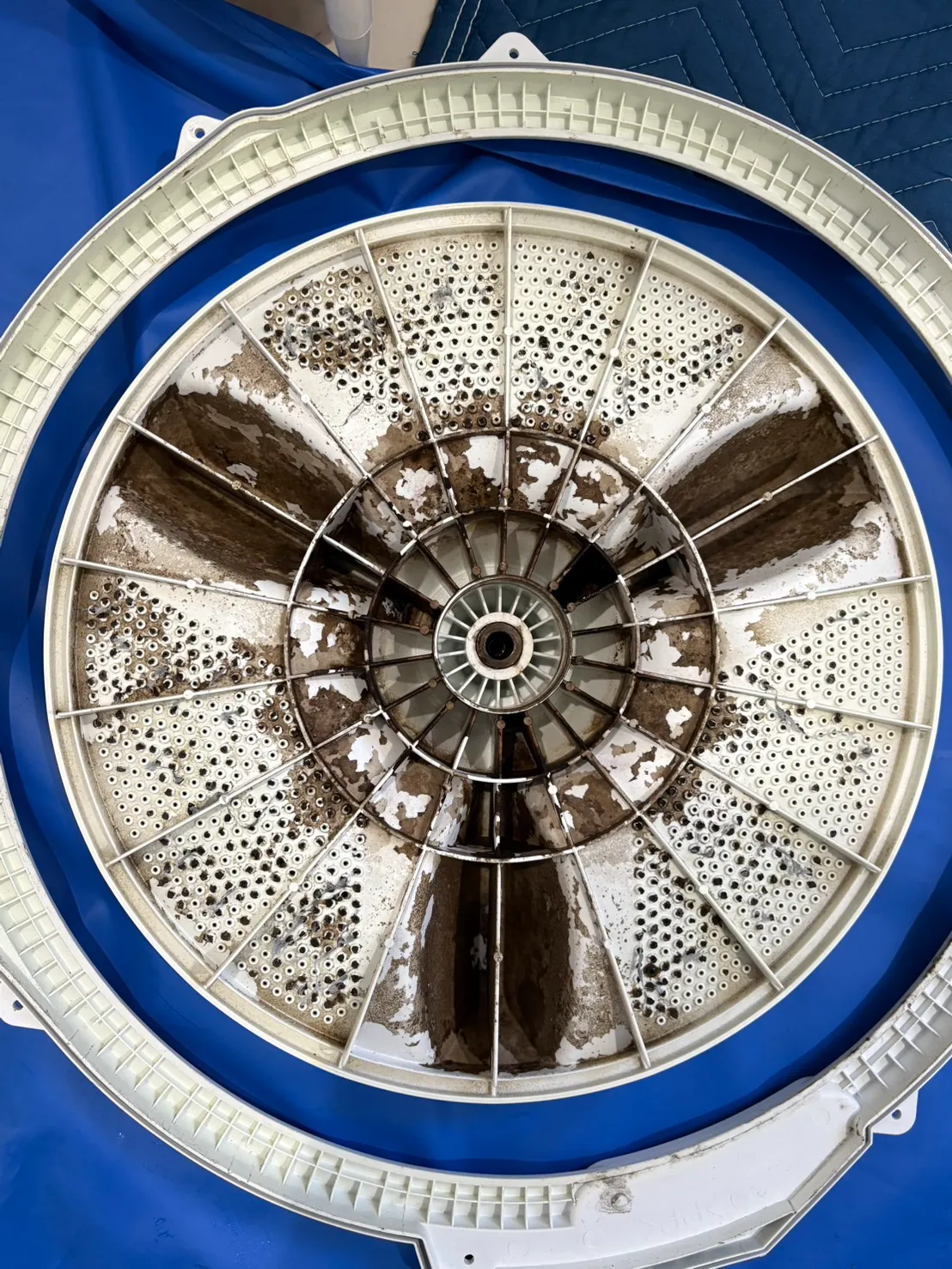 外側だけでなく、普段見えない洗濯槽の裏側やパルセーター、配管部分まで丁寧に分解・洗浄することで、ニオイや黒カビの原因を根本から除去できます。